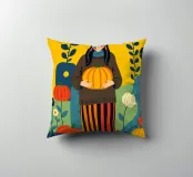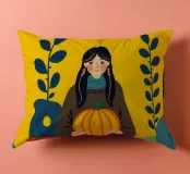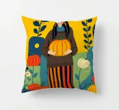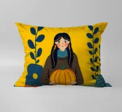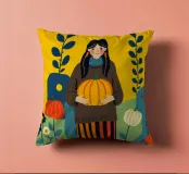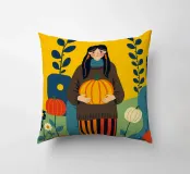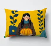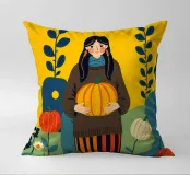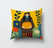 Illustrazione di una giovane donna che raccoglie e tiene in mano una zucca in un campo di zucche. È ricca di colori caldi e autunnali - arancioni profondi, blu ricchi, verdi scuri e giallo oro - che evocano la sensazione dell'autunno o della stagione del raccolto. Cattura anche una scena autunnale piena di calma, natura e tradizione associata al raccolto, al ringraziamento e al ciclo di crescita e cambiamento.