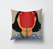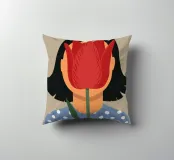 Un ritratto surreale e intrigante in cui il volto di una donna è oscurato da un grande tulipano rosso. Il suo top a pois e lo sfondo semplice creano un'immagine misteriosa e artistica che gioca con l'identità e la natura.