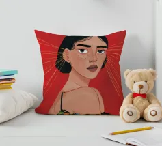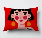 Questo dipinto raffigura una persona con i capelli neri che indossa un abito colorato con forme geometriche. Lo sfondo è rosso e la persona è adornata con grandi orecchini circolari.