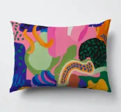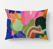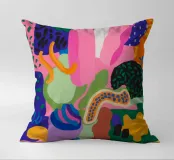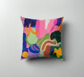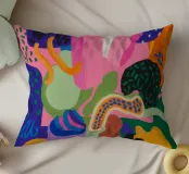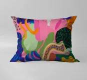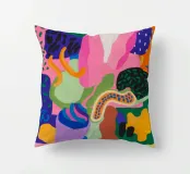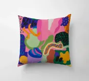 Una composizione astratta vivace e giocosa, caratterizzata da una serie di forme organiche simili a blob in blu, rosa e giallo. Le forme spontanee e i colori energici creano un senso di gioiosa espressione artistica.