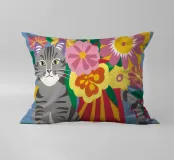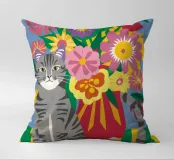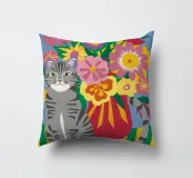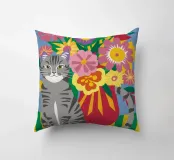 Un gatto soriano grigio siede maestosamente davanti a un vivace bouquet di fiori colorati in un vaso a righe, su uno sfondo giallo, evidenziando un ritratto di animale domestico giocoso ma regale.