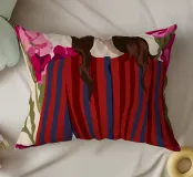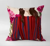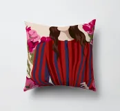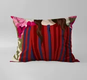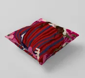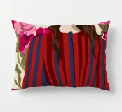 Un dipinto di una persona con un vestito a righe rosse e blu, circondata da fiori rosa.