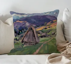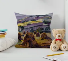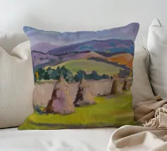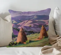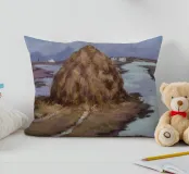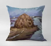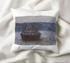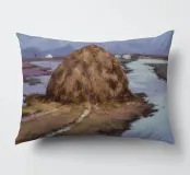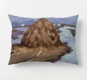 Un dipinto di paesaggio con un grande pagliaio in un campo vicino a un fiume o a uno specchio d'acqua tranquillo. Il cielo è di un grigio tenue e coperto, e la tavolozza generale è sobria con toni terrosi.