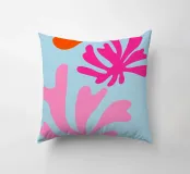 arte botanica astratta, forme moderne di piante, foglie di corallo rosa, illustrazione del sole arancione, sfondo blu pastello, design floreale minimalista, natura astratta contemporanea, grafica fogliare giocosa, opera d'arte dalle forme audaci, stampa ispirata a Matisse, atmosfera moderna tropicale, flora astratta vibrante