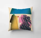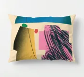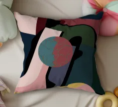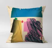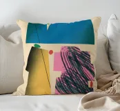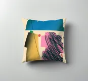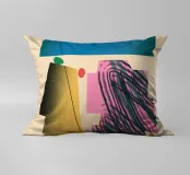 Forme geometriche audaci in blu, giallo e rosa contrastano con uno sfondo neutro. Ombre organiche e punti colorati creano una composizione dinamica e astratta.