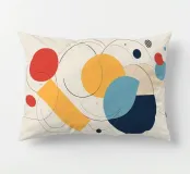 L'opera d'arte presenta una disposizione dinamica di forme geometriche dai colori vivaci. Cerchi, rettangoli e linee si intrecciano, creando un senso di movimento ed equilibrio.