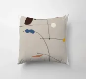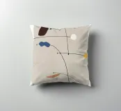 Le forme astratte sono collegate da sottili linee nere su uno sfondo beige chiaro, creando un senso di equilibrio. La composizione presenta varie forme geometriche in diversi colori, tra cui marrone, rosso, blu, bianco e giallo.