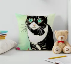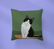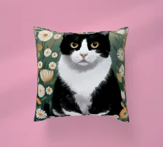 Un bel gatto tuxedo bianco e nero siede in una posizione composta ed elegante, guardando direttamente l'osservatore con un'espressione calma e gentile, catturata in un ritratto semplice e bello.