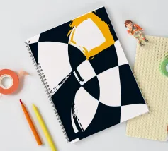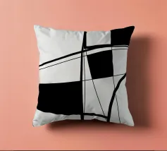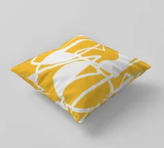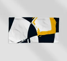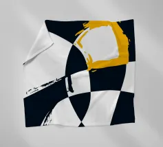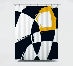 Audaci motivi geometrici si intrecciano con un sorprendente accento giallo in un design che enfatizza il contrasto. Le forme curve e angolari in bianco e nero creano un flusso visivo dinamico.
