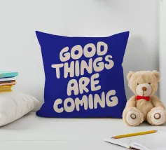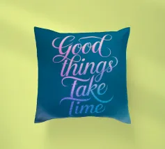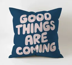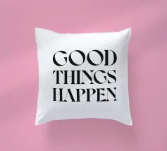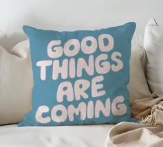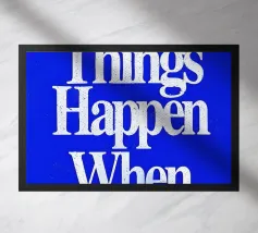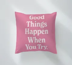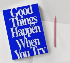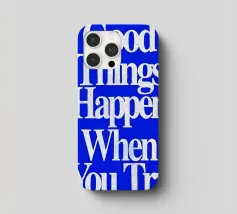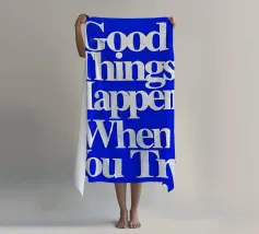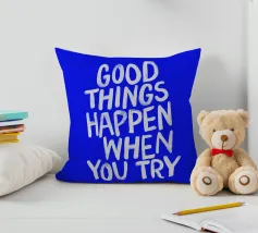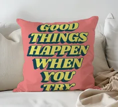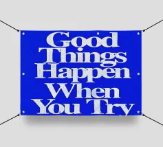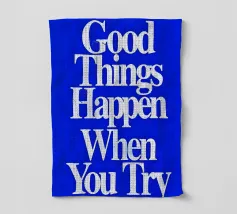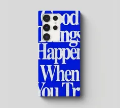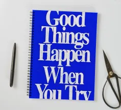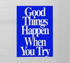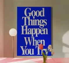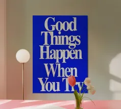 "Il messaggio edificante 'Good Things Happen When You Try' (Le cose belle accadono quando ci provi), presentato in una tipografia testurizzata di colore bianco sporco su uno sfondo blu vibrante, crea un senso di speranza e incoraggiamento. La texture leggermente rovinata aggiunge un tocco vintage e accessibile al design",
