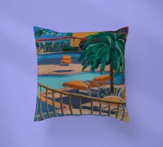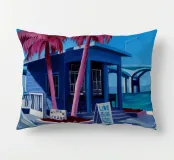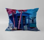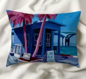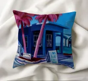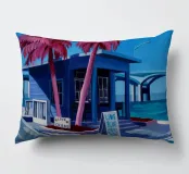 Un dipinto di un edificio modernista con un caratteristico tetto angolato, probabilmente in un luogo come Palm Springs, caratterizzato da linee pulite, palme e una fresca luce blu.