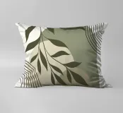 Un ramo di foglie si sovrappone a forme geometriche, tra cui linee arcuate e toni sfumati e stratificati. La combinazione crea un connubio armonioso tra natura e design astratto.