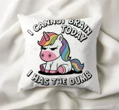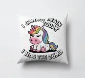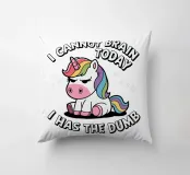 Un simpatico unicorno con una criniera arcobaleno siede circondato da stelle, accompagnato dal testo umoristico "Oggi non posso fare il cervello, ho il muto". L'immagine è collocata su uno sfondo semplice.