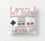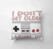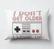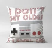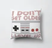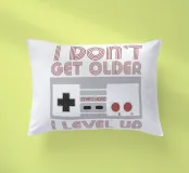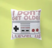 Un controller di gioco retrò è accompagnato dalla frase "Non invecchio, salgo di livello", utilizzando uno stile di carattere nostalgico. Questo design combina la cultura del gioco vintage con una visione umoristica dell'invecchiamento.
