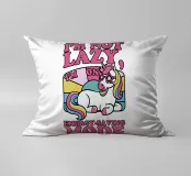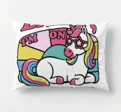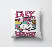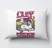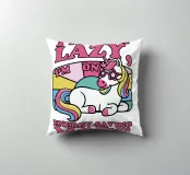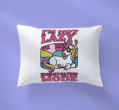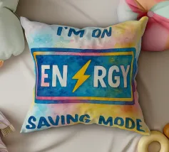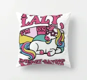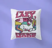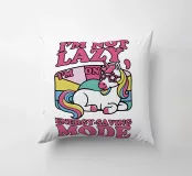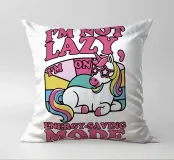 Un unicorno colorato con una criniera arcobaleno si trova sotto la frase "Non sono pigro, sono in modalità risparmio energetico" in lettere rosa. Lo sfondo è caratterizzato da un blocco di colori pastello che esalta il tema giocoso e stravagante.