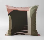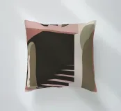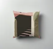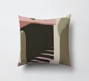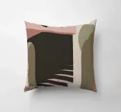 Illustrazione architettonica di una scala a chiocciola all'interno di un edificio con archi e pareti dai colori tenui. La tavolozza pastello di rosa, beige e verde crea un'atmosfera sognante, serena e leggermente surreale.