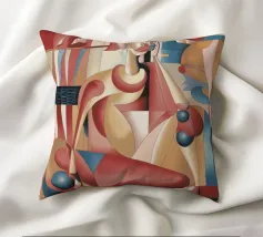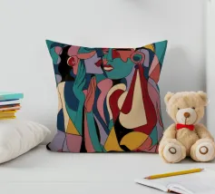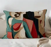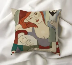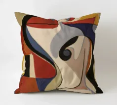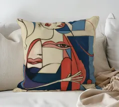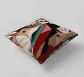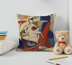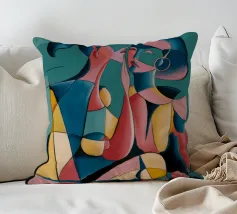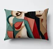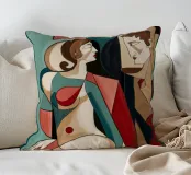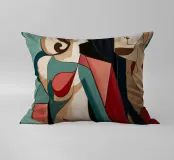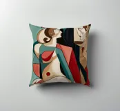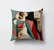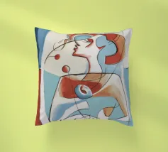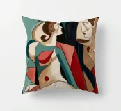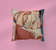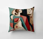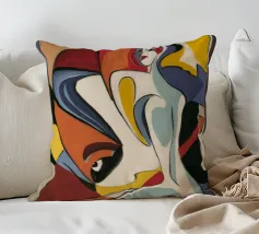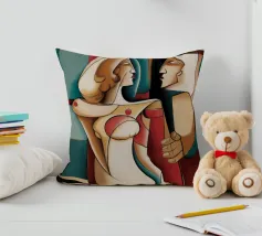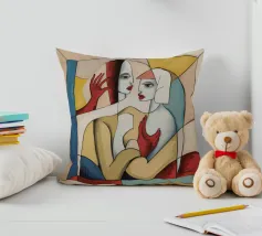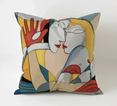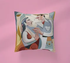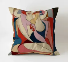 Questo dipinto presenta due figure astratte in una posa intima e ravvicinata. L'uso di forme geometriche e di colori decisi aggiunge profondità e complessità alla scena.