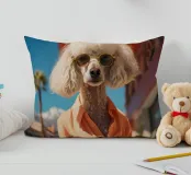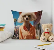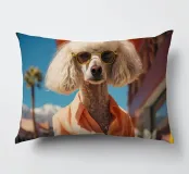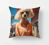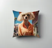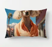 Isabelle, la barboncina dal pelo bianco, passeggia elegantemente per le strade di Palm Springs, indossando un superbo completo arancione. Con i suoi occhiali da sole dorati e il suo atteggiamento sicuro, incarna lo spirito della controcultura della Beat Generation che ha segnato la città, combinando uno stile di vita eccentrico con il senso della moda.
