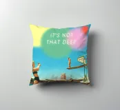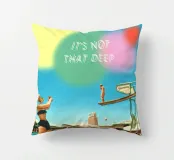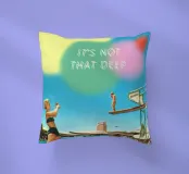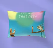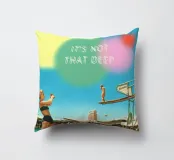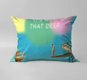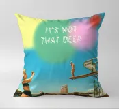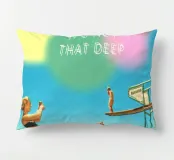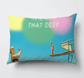 Donna che fotografa un uomo in procinto di saltare in piscina. Cielo aura sfumato e citazione 'Non è così profondo'. Surreale design retrò con piscina di motel vintage di MsGonzalez