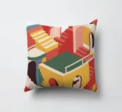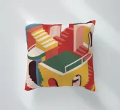 Un complesso e impossibile labirinto architettonico di scale, archi e porte dai colori vivaci.