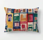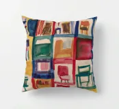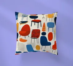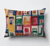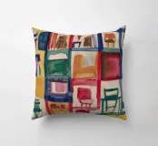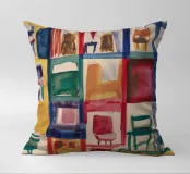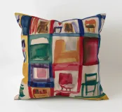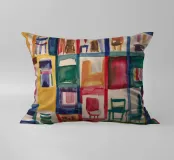 Una griglia vivace di sedie e scaffali colorati dipinge un interno astratto di ricordi stratificati e ordine giocoso.