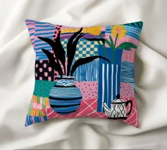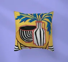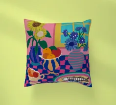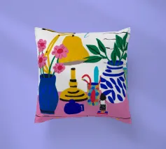 Una natura morta moderna ed eclettica con un paralume a scacchi, un vaso a zig zag e un fiore stilizzato. I motivi e le forme audaci creano una composizione divertente, grafica e di grande stile.