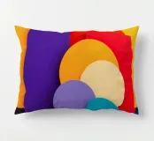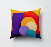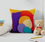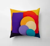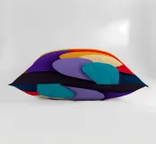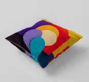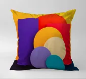 Vibranti forme geometriche in viola, rosso, giallo e blu si sovrappongono su un audace sfondo giallo e scuro, mostrando un'arte astratta dal tocco moderno.
