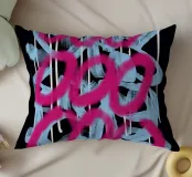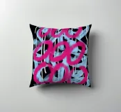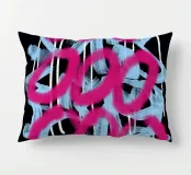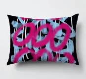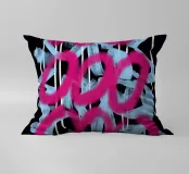 Vivaci pennellate rosa formano forme ad anello su uno sfondo di vernice blu pallido su un fondale nero. Gocce di vernice bianca scendono dagli accumuli di colore più spessi, dando un senso di movimento alla composizione.