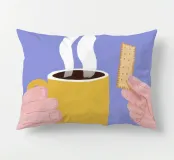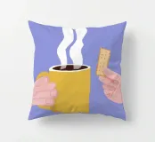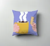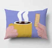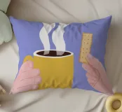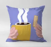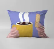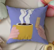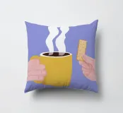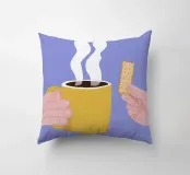 Un'illustrazione semplice e confortante di una mano che tiene una tazza gialla e calda di caffè o tè fumante, con un biscotto pronto per essere inzuppato. L'immagine cattura perfettamente il piacere semplice e tranquillo di un rituale mattutino.