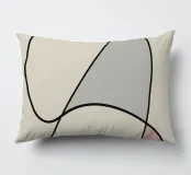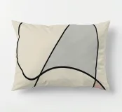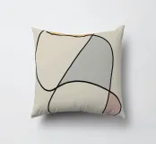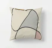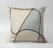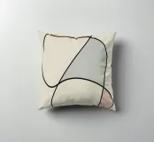 Forme astratte in colori tenui sono collegate da sottili linee nere, creando un design minimalista. Le forme includono toni morbidi di giallo, grigio e rosso, su uno sfondo beige neutro.