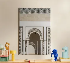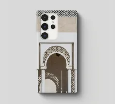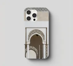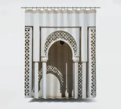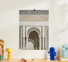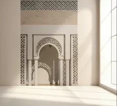 Architettura marocchina. Arco in un edificio in Marocco. Edificio bianco e beige con ombra sul muro. Architettura tradizionale con decorazione.