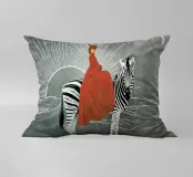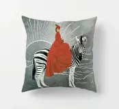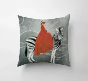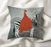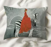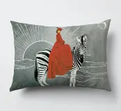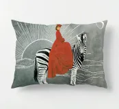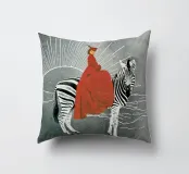 Dipinto vintage di una donna in elegante abito rosso che cavalca la sua zebra verso l'orizzonte al tramonto. Collage a tecnica mista di MsGonzalez