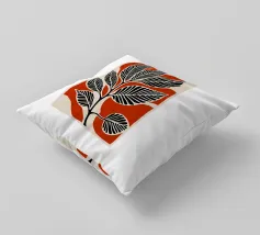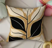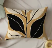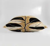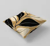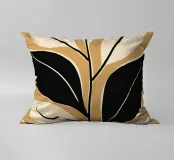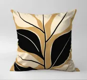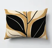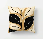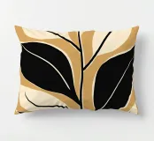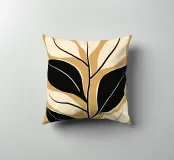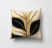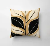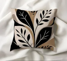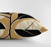 Un disegno botanico stilizzato presenta foglie nere e crema su uno sfondo caldo e abbronzato. Il contrasto tra gli elementi scuri e quelli chiari mette in risalto le forme semplici e suggestive delle foglie.