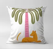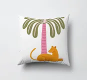Un disegno giocoso con un grosso felino arancione (leonessa) che riposa sotto una palma.