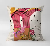 Un'illustrazione stravagante di gambe ornate da calzini rosa a righe e delicati fiori in fiore. Lo sfondo è caratterizzato da giocosi pois neri, che aggiungono un'estetica retrò e moderna. Una fusione di moda e natura, questa opera d'arte emana fascino e creatività.