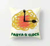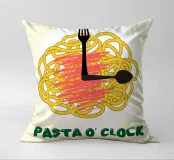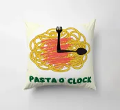 Una grafica giocosa presenta un mucchio di spaghetti con forchetta e cucchiaio disposti come lancette di un orologio, a suggerire che è ora di mangiare la pasta. La frase "PASTA O' CLOCK" è scritta in grassetto sotto.
