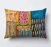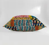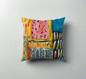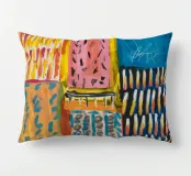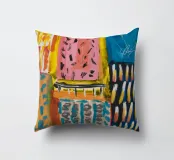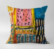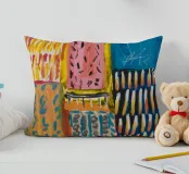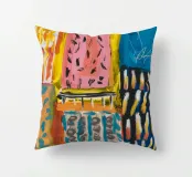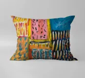 Un patchwork di motivi diversi, tra cui linee e forme a U, nei vivaci colori giallo, blu, rosa e rosso, crea un colorato effetto mosaico in questo pezzo astratto.