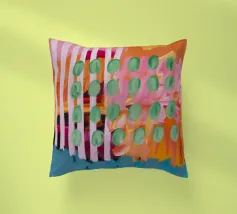 Un patchwork di motivi diversi, tra cui linee e forme a U, nei vivaci colori giallo, blu, rosa e rosso, crea un colorato effetto mosaico in questo pezzo astratto.