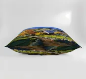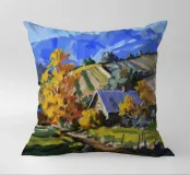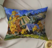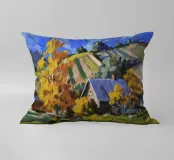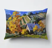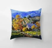 Un pittoresco paesaggio autunnale che raffigura un villaggio o una fattoria adagiata su una collina, circondata da un mosaico di alberi colorati nei toni dell'arancione e del giallo e da campi coltivati, con le lontane montagne blu a completare la scena.