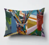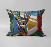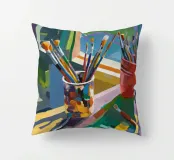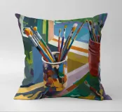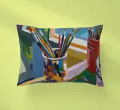 Un vivace barattolo di pennelli si trova alla luce del sole su un tavolo da studio, traboccante di potenziale artistico.