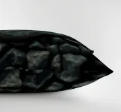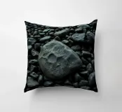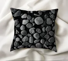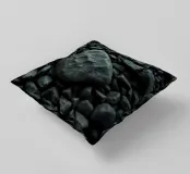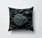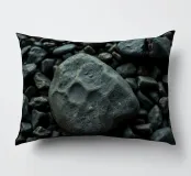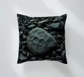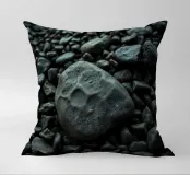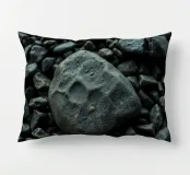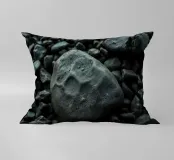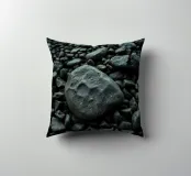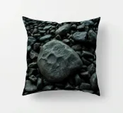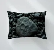 Rocce di varie forme e dimensioni sono adagiate su una spiaggia, con un'attenzione particolare a una pietra unica e strutturata. L'ambiente appare tranquillo, con la luce del crepuscolo che mette in risalto il paesaggio naturale.