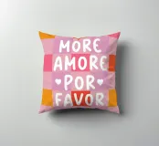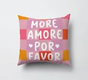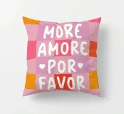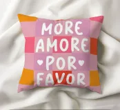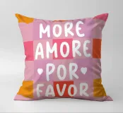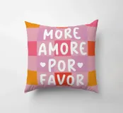Il moderno poster di testo con la scritta "More Amore Por Favor" combina grandi lettere giocose in caratteri bianchi su un vivace sfondo a scacchiera. I colori rosa, bianco, arancione e rosa conferiscono al disegno un'allegra atmosfera estiva, ispirata all'Italia. Questo design grafico a motivi irradia amore e gioia di vivere.