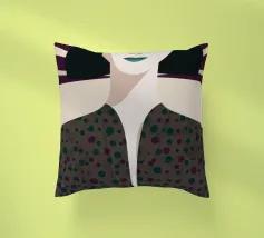 Il dipinto raffigura una persona con capelli corti e scuri acconciati a onde, che indossa un abito con motivi retrò e cerchi e diamanti nei toni del rosa, del marrone e del beige. Lo sfondo è di un semplice colore beige chiaro.