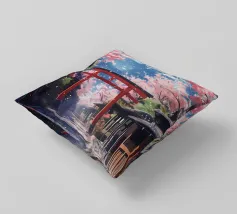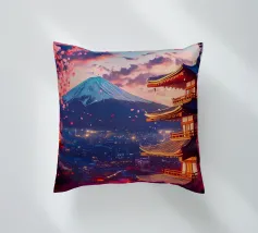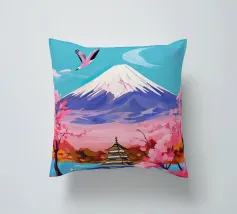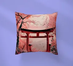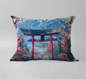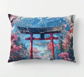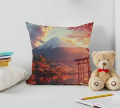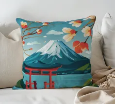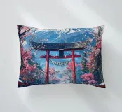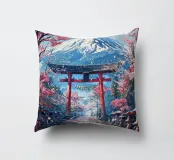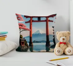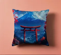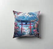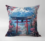 Questa scena serena cattura la bellezza di un sentiero fiancheggiato da fiori di ciliegio con porte torii, che conduce al maestoso Monte Fuji.