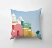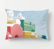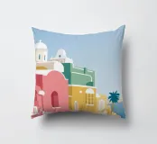 Una pittoresca illustrazione degli iconici edifici bianchi e delle cupole blu di un'isola greca, probabilmente Santorini, affacciata sul mare. La scena è una perfetta rappresentazione, inondata di sole, di un paradiso mediterraneo.