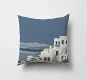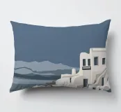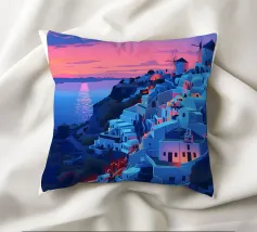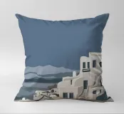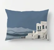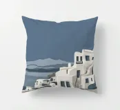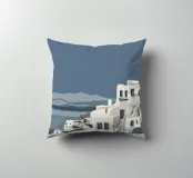 Una rappresentazione minimalista dell'iconica architettura imbiancata di Santorini, in Grecia, sotto un cielo calmo e crepuscolare, che trasmette un profondo senso di pace, tranquillità e bellezza senza tempo.