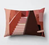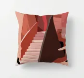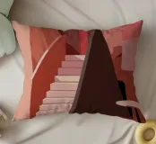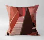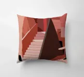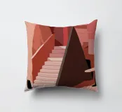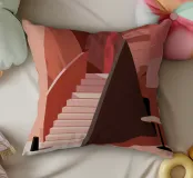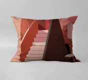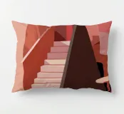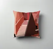 Un'imponente scalinata domina uno spazio interno reso interamente in toni di rosa, salmone e terracotta, creando una scena calda, monocromatica e lunatica.