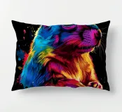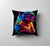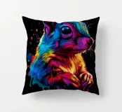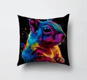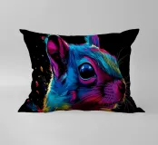 Uno scoiattolo curioso si affaccia vivacemente dal quadro, raffigurato con colori intensi e brillanti su uno sfondo nero. La tavolozza dei colori spazia dal blu intenso e dal rosa brillante al giallo caldo e al rosso vibrante. I passaggi sono fluidi e ricordano le pennellate, mentre singoli schizzi e gocce di colore conferiscono al motivo un effetto dinamico, quasi esplosivo. L'animale appare vigile e vivace, con dettagli finemente lavorati nella sua pelliccia e un grande occhio lucido che guarda direttamente lo spettatore.