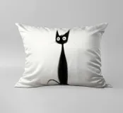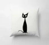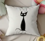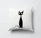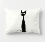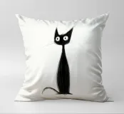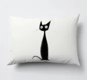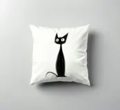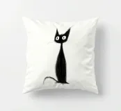 Illustrazione minimalista in bianco e nero di un elegante gatto nero con occhi esageratamente grandi e lineamenti abbozzati. Il disegno astratto e stravagante del gatto aggiunge un tocco artistico e giocoso.