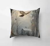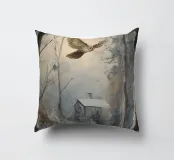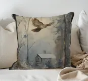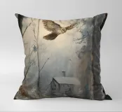 In una tranquilla foresta innevata, un gufo plana silenzioso su una capanna solitaria. I colori tenui e la luce soffusa conferiscono alla scena un'atmosfera misteriosa e pacifica. Questo suggestivo dipinto invernale cattura la bellezza della natura e la magia della solitudine invernale, simbolo di tranquillità e contemplazione.